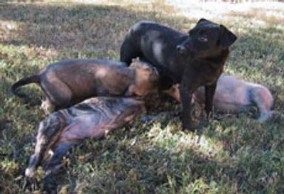 Last year we lost a mastiff mother shortly after whelping. Luckily our Patterdale named "Pitch" had a small litter the week before. Suffering from near exhaustion from bottle feeding, I offered the three mastiff pups to Pitch. She fondled them quietly and within minutes started nursing and caring for them. They spent the next weeks in the box alongside the Patterdale pups.